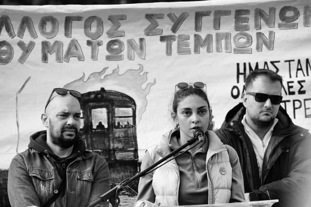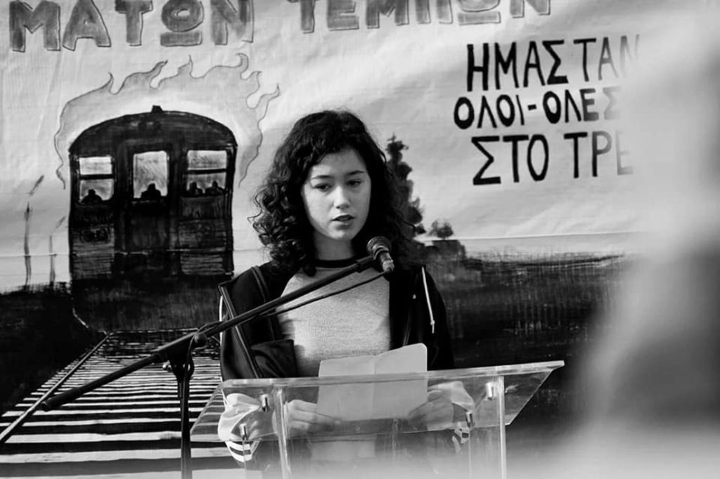Στην εξέδρα μιλά η Κατερίνα Αντωνοπούλου. Μιλάει και στη νοηματική. Επιζώσα. Βρισκόταν μαζί με τον γάτο της στο δεύτερο βαγόνι του Intercity 62. Η ίδια τραυματίστηκε, αλλά βγήκε ζωντανή.