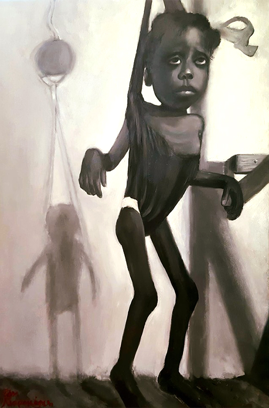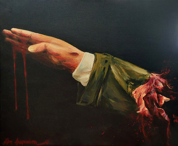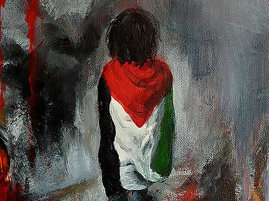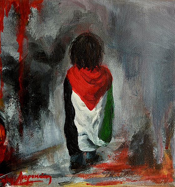 Μιλώντας για την λογοκρισία στην κουβέντα μας από κοντά, η συζήτηση οδηγήθηκε στην Παλαιστίνη και την γενοκτονία στη Γάζα. Ένα διαρκές έγκλημα που συντελείται με ευθύνη της Δύσης τα τελευταία 75 -τουλάχιστον- χρόνια. Από όπου και άντλησε την έμπνευση για τον παρακάτω πίνακα.