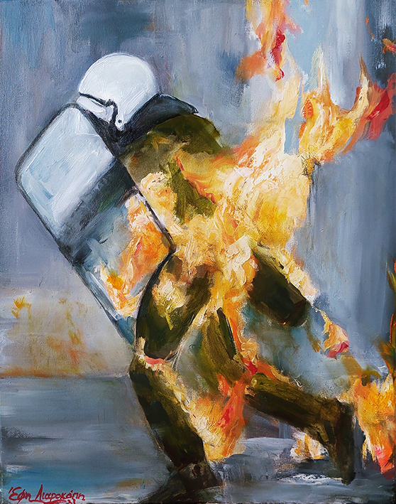 Ύστερα ο πίνακας «Δεν θα ζητήσω συγγνώμη από κανένα δεκαπεντάχρονο» ή για τους φίλους «Μπάτσος που καίγεται» ξεκίνησε σαν ιδέα όταν ο Κορκονέας δολοφόνησε τον Γρηγορόπουλο σε μια εποχή που η Έφη βρισκόταν στο Λονδίνο, παρακολουθούσε παθητικά το τι συνέβαινε και ένοιωσε πως δεν μπορούσε να βρίσκεται μακριά από την Ελλάδα. Ο πίνακας ολοκληρώθηκε με την δολοφονία του 16χρονου Κ. Φραγκούλη.