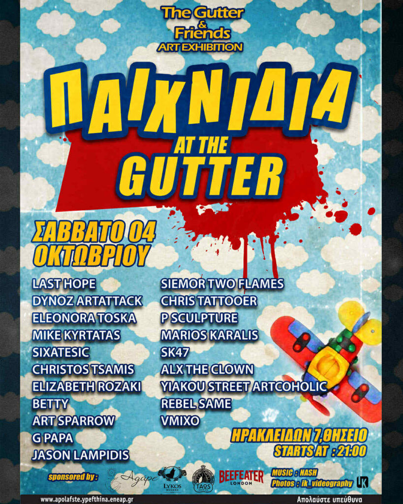 Το @thegutterathens σας προσκαλεί στην ετήσια έκθεση ζωγραφικής με θέμα «Παιχνίδια» που θα γίνει το Σάββατο 4/10 και ώρα 21:00. Είκοσι καλλιτέχνες, (tattoo artists, γλύπτες, graffiti artists και illustrators) θα παρουσιάσουν τα έργα τους σε ένα μεγάλο event στην καρδιά του Θησείου.