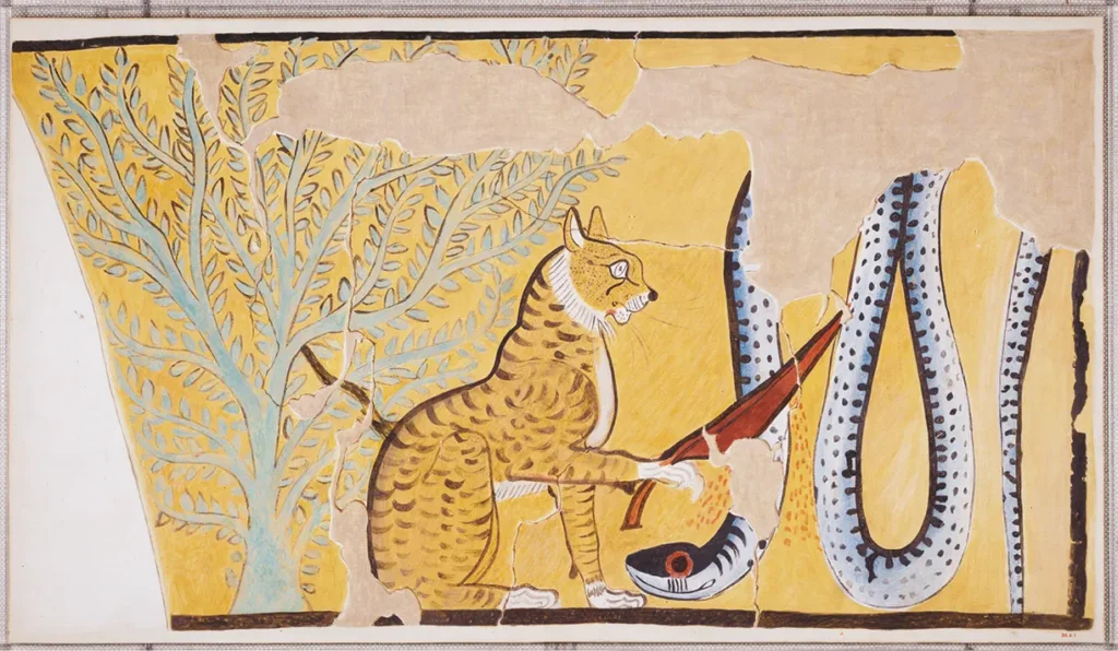 Ο θεός Ρα με την μορφή Καρακάλ, αποκεφαλίζει το φίδι Απεπ. Από τον τάφο του Σεμετζέμ.