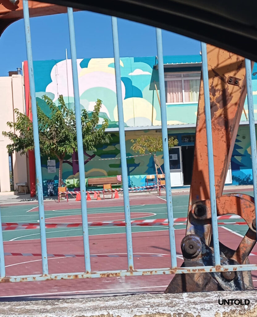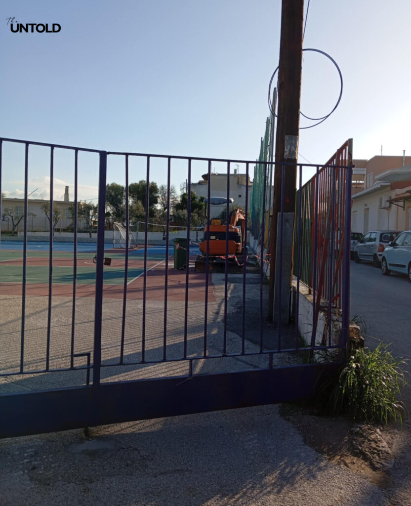 Με το πέρασμα των εβδομάδων, η κατάσταση όχι μόνο δεν διορθώθηκε αλλά επιδεινώθηκε. Όπως περιέγραψε στο Untold μητέρα μαθητή του συγκεκριμένου σχολείου, ο προαύλιος χώρος, όπου καθημερινά παίζουν δεκάδες παιδιά, μετατράπηκε σε πεδίο επικινδυνότητας, ενώ στο σημείο προστέθηκε και ένα μικρό μηχάνημα έργου, αυξάνοντας την πιθανότητα ατυχήματος. Η εικόνα μαθητών να παίζουν λίγα μέτρα από πεσμένες μεταλλικές κατασκευές και βαριά μηχανήματα αποτυπώνει με ακρίβεια τη σοβαρότητα της κατάστασης.
