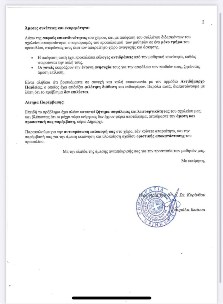 Επειδή το πρόβλημα έχει πλέον καταστεί ζήτημα ασφάλειας και λειτουργικότητας του σχολείου μας, και βλέποντας ότι οι μέχρι τώρα ενέργειες δεν έχουν φέρει αποτέλεσμα, αιτούμαστε την άμεση και προσωπική σας παρέμβαση, κύριε Δήμαρχε.