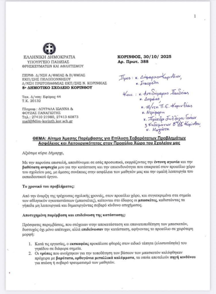 Στο 8ο Δημοτικό Σχολείο Κορίνθου, ένα πρόβλημα που ξεκίνησε ως τεχνική εκκρεμότητα έχει εξελιχθεί σε υπόθεση δημόσιας ασφάλειας και διοικητικής αδράνειας. Από την αρχή της σχολικής χρονιάς, δύο μπασκέτες του σχολείου βρέθηκαν πεσμένες στο έδαφος του προαυλίου χώρου, δημιουργώντας έναν ορατό κίνδυνο για τους μαθητές.