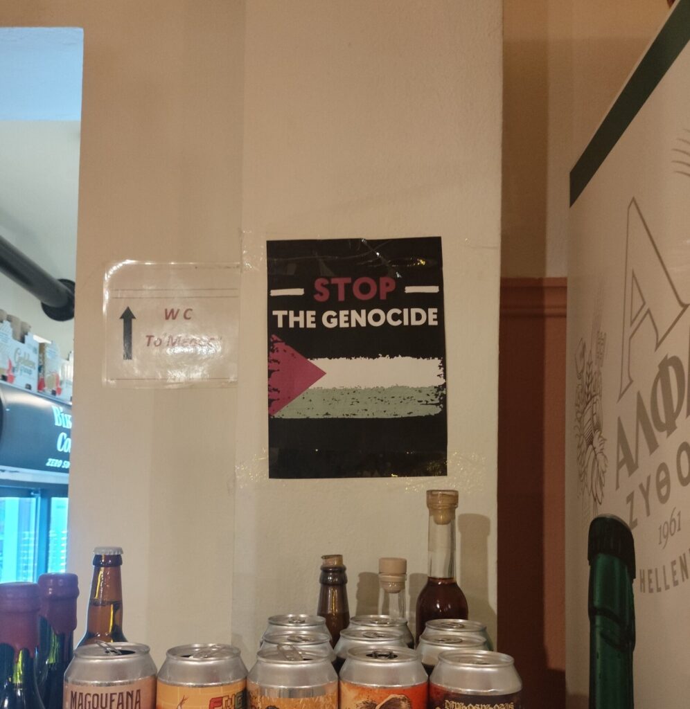 » Πληροφορηθήκαμε ότι ήταν Βρετανοί Εβραίοι όταν η κυρία Jude Lobb, μέλος του Ισραηλινού οργανισμού στρατηγικού σχεδιασμού ELNET που εκπονεί πολεμικά σχέδια στο Ισραήλ και προωθεί την στρατιωτική συνεργασία Βρετανίας -Ισραήλ, όρμηξε να σκίσει το αυτοκόλλητο, φώναξε στους υπόλοιπους πελάτες να φύγουν από το μαγαζί γιατί είμαστε ρατσιστές με τους Εβραίους και πήρε την παρέα της να φύγει χωρίς να πληρώσει ενώ είχαν φάει».