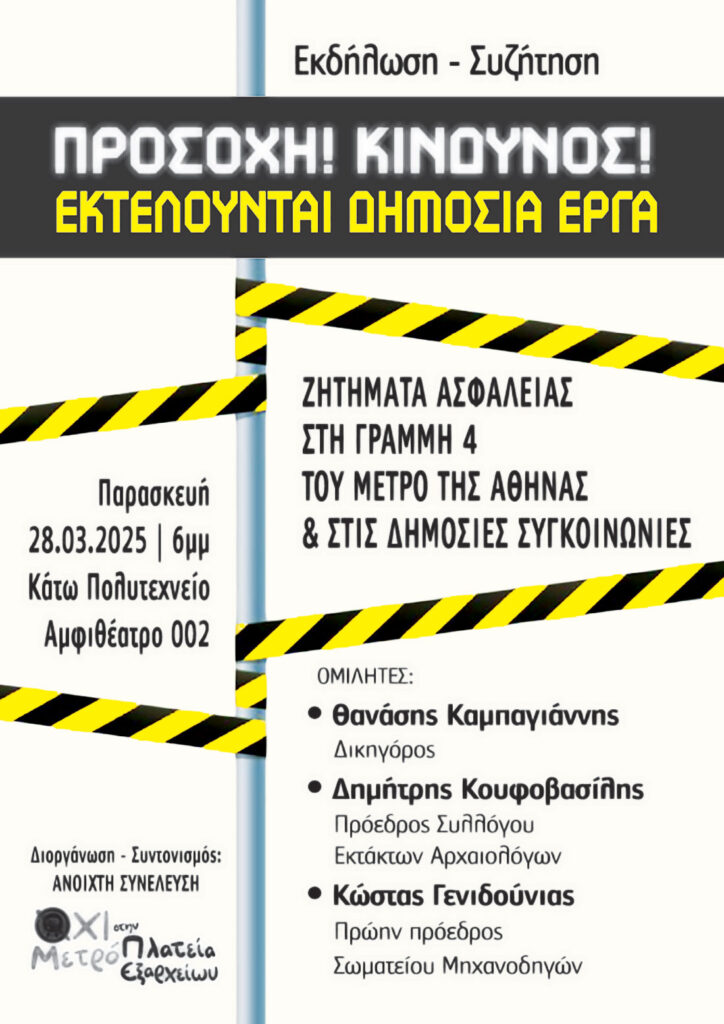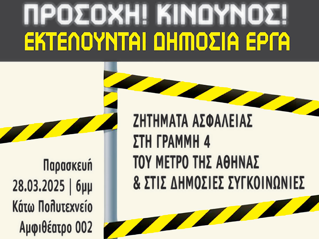 Την Παρασκευή 28 Μαρτίου στις 6 μ.μ., η Ανοιχτή Συνέλευση “Όχι μετρό στην πλατεία Εξαρχείων” διοργανώνει εκδήλωση-συζήτηση στο αμφιθέατρο 002 του Κάτω Πολυτεχνείου πάνω στο συνολικό ζήτημα ασφάλειας/ανασφάλειας στον σχεδιασμό και τη λειτουργία των δημόσιων συγκοινωνιών.