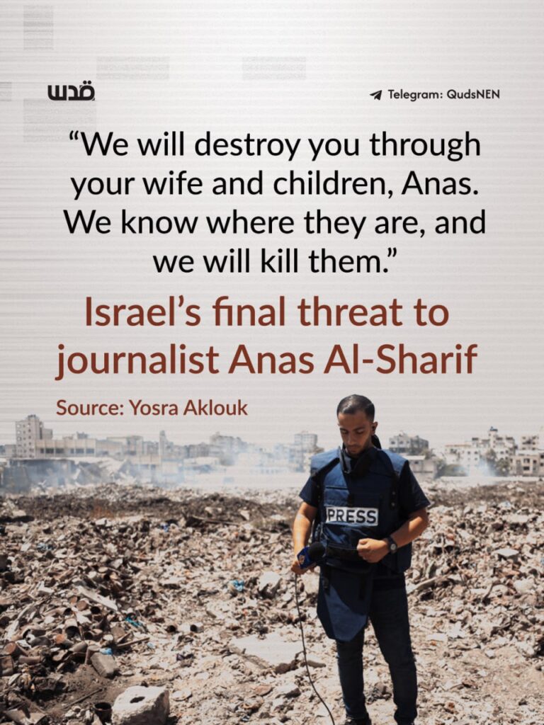 Στις 10 Αυγούστου, ο ισραηλινός στρατός σκότωσε έξι δημοσιογράφους σε μια επίθεση που παραδέχτηκε ανοιχτά ότι είχε ως στόχο τον δημοσιογράφο του Al Jazeera Ανάς Αλ Σαρίφ. Δύο μήνες νωρίτερα, τον Ιούλιο, η Επιτροπή για την Προστασία των Δημοσιογράφων (CPJ) είχε προειδοποιήσει ότι φοβόταν για τη ζωή του Αλ Σαρίφ, λέγοντας ότι ήταν «στόχος μιας ισραηλινής στρατιωτικής εκστρατείας δυσφήμισης, την οποία ο ίδιος θεωρεί προάγγελο της δολοφονίας του».