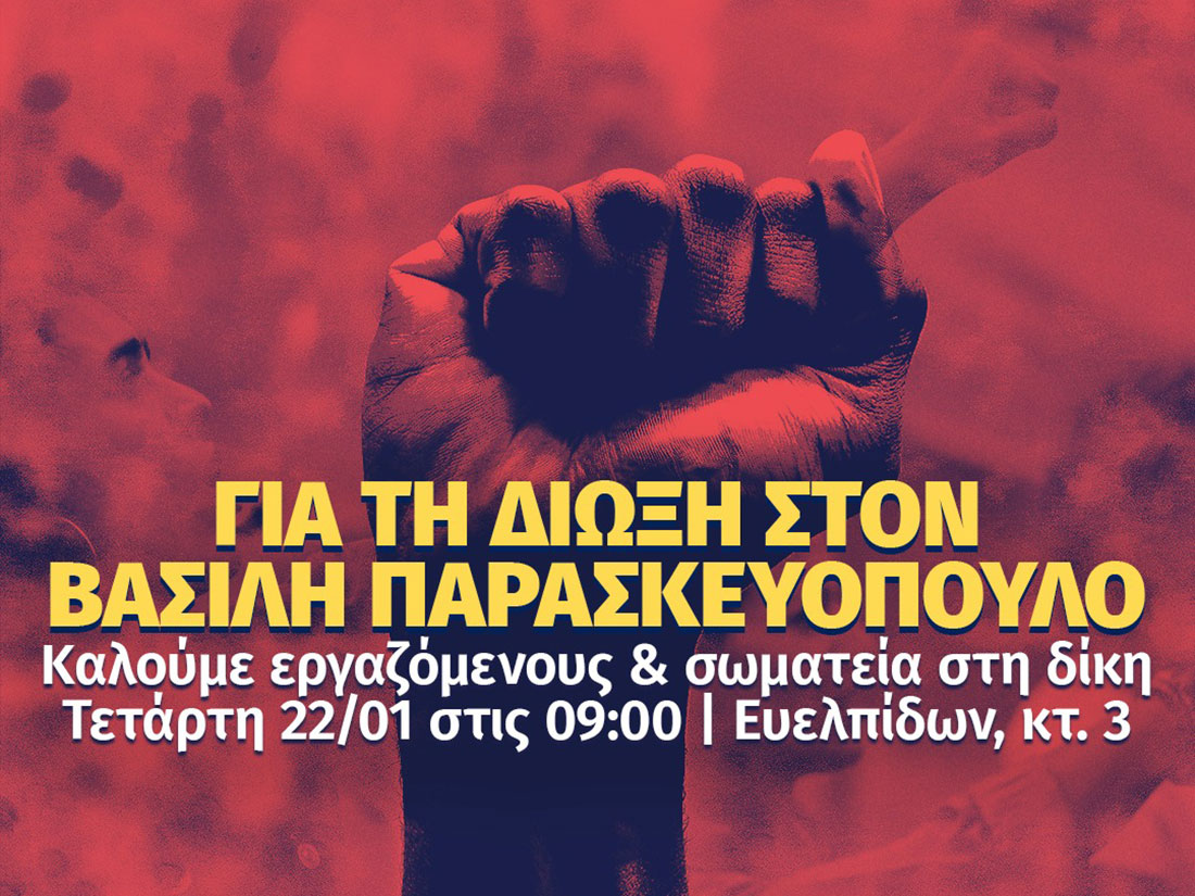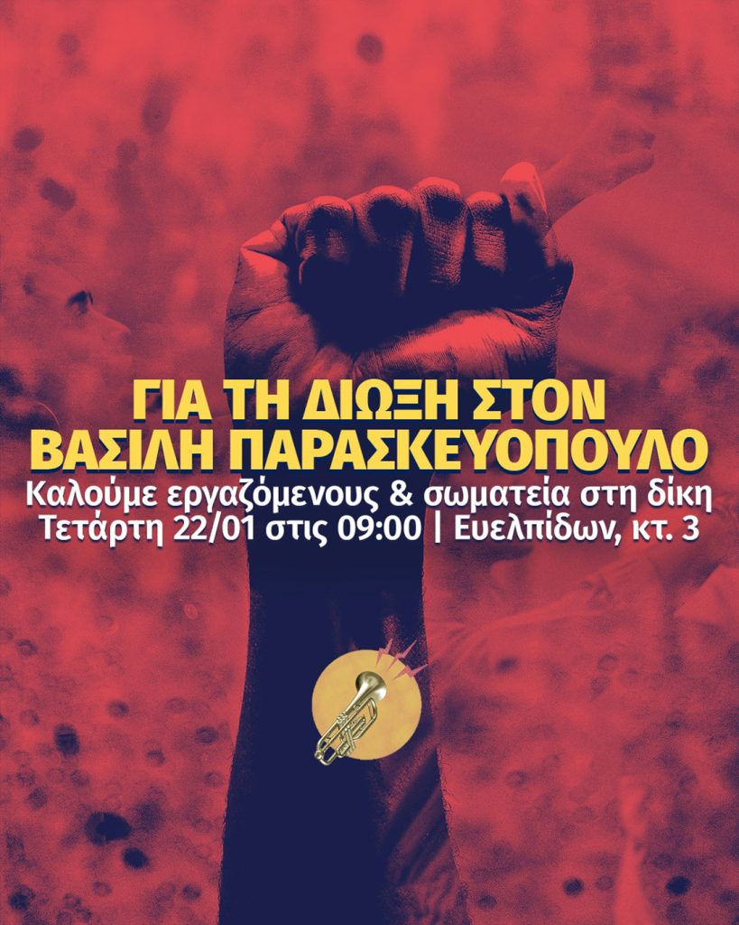 Κάλεσμα έξω από το κτίριο 3 της Ευελπίδων απευθύνει ο Πανελλήνιος Μουσικός Σύλλογος για την ερχόμενη Τετάρτη 22/1, στις 9 το πρωί, όπου θα διεξαχθεί η δίκη του προέδρου του σωματείου Βασίλη Παρασκευόπουλου με την κατηγορία της «παρεμπόδισης λειτουργίας κοινόχρηστων συγκοινωνιακών μέσων».