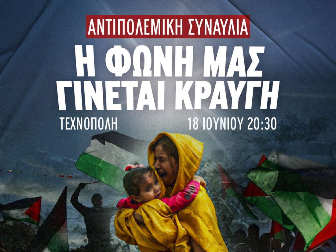 Την Τετάρτη 18 Ιουνίου στις 20:30, δεκάδες καλλιτέχνες ενώνουν τις φωνές τους στην Τεχνόπολη του Δήμου Αθηναίων σε μια αντιπολεμική συναυλία – διαμαρτυρία για τη στήριξη του Παλαιστινιακού λαού και την καταδίκη της γενοκτονίας στη Γάζα.