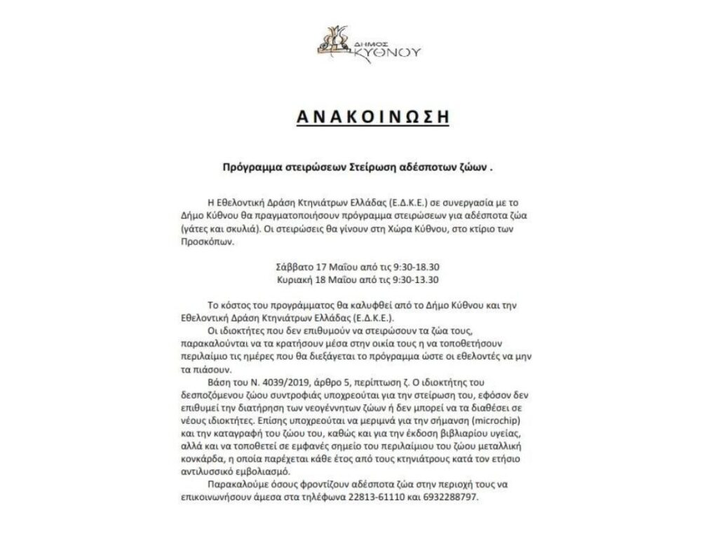 «Η αστυνομία δεν έκανε ποτέ σωστά την δουλειά της. Ενώ το βράδυ της φρίκης τα παιδιά, κάποιοι από τους συναδέλφους, πήγαν στην αστυνομία να καταγγείλουν. Έπρεπε αν βγουν έξω. Να ψάξουν φόλες, να μαζέψουν υλικό να σταλθεί για ανάλυση. Να μαζέψουν τυχόν νεκρά ζώα να σταλθούν για νεκροψία, τοξικολογικές, κάτι… Δεν έκαναν τίποτα! Απευθύνθηκα στο αρχηγείο αστυνομίας με email και τηλέφωνα. Δεν ξέρω τι έγινε μετά.. Μίλησα με τον κ. Χρυσάκη ζητούσα απεγνωσμένα βοήθεια και να κάνουν την δουλειά τους! Όλα αυτά που σας γράφω διαδραματίζονται μέχρι σήμερα. Προσπαθώ να βγάλω άκρη! Ο ΔΗΜΟΣ ΚΥΘΝΟΥ εγκληματικά αμέτοχος και μάλιστα ήταν ξεκάθαρη η προσπάθεια του να συγκαλύψει. Με αγνοούσε. Έπαιρνα τηλέφωνα, ακόμα και σε κινητά που μου έδωσαν κάτοικοι του νησιού. Με κορόιδευαν με δικαιολογίες. Δεν έκαναν καν ανάρτηση δελτίο Τύπου για τις φόλες ώστε να προστατευτούν έστω άλλοι άνθρωποι και τα ζώα τους και τα παιδιά τους! Παρά μόνο έκαναν μια ανάρτηση πέντε μέρες μετά αφού τους είχα πιέσει εξωφρενικά και αφού έστειλα και e-mail στον δήμο να κάνουν την ανάρτηση. Είναι οργανωμένο όλο φαίνεται! Δεν μου σήκωναν από ένα σημείο και μετά καν τα τηλέφωνα! Χαρακτηριστικά ο Δήμαρχος Γαρδέρης της τελευταία φορά που το σήκωσε είπε θα σας πάρω σε μια ώρα μου το έκλεισε ειρωνικά και δεν ξαναπήρε ποτέ. Ούτε το σήκωσε ξανά!».