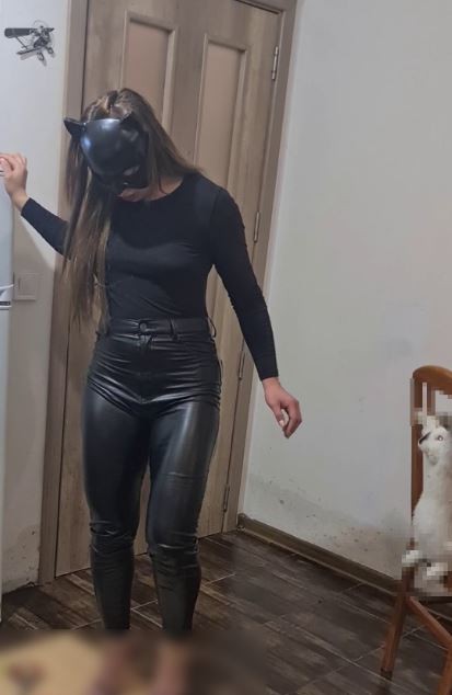 Αυτή είναι η πόζα της όπως στραγγαλίζει ένα γατί φορώντας λάτεξ γάντια.